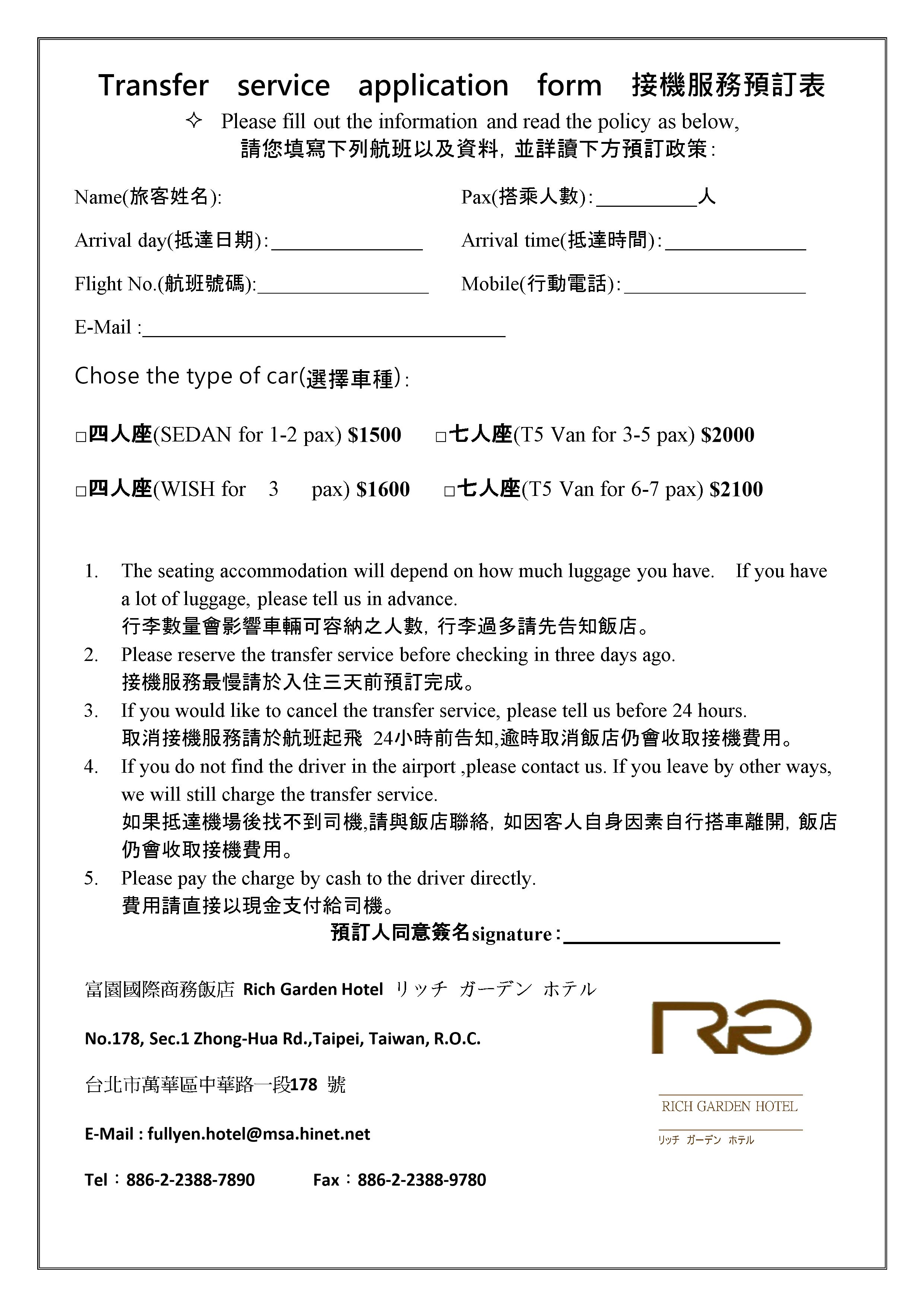 Customers who need to arrange for airport pick-up, please complete the airport pick-up reservation form below and send it to our email address: fullyen.hotel@msa.hinet.net.