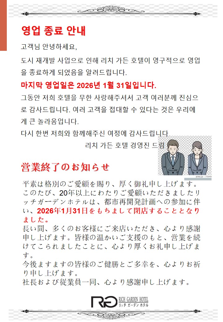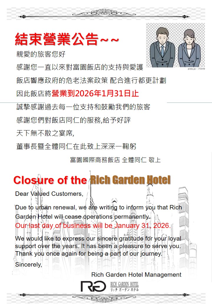 親愛的旅客您好 感謝您一直以來對富園飯店的支持與愛護 飯店響應政府的危老法案政策 配合進行都更計劃 因此飯店將營業到2026年1月31日止